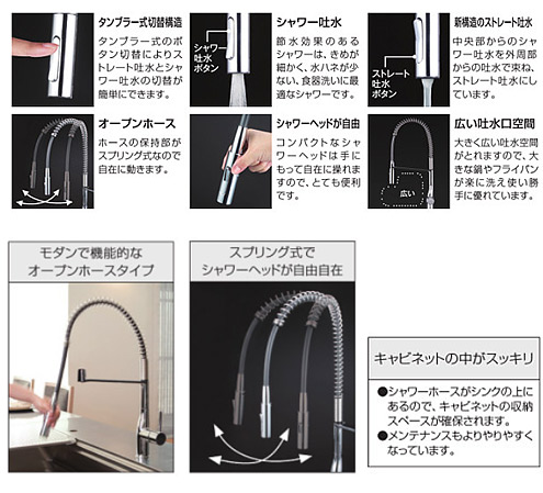キッチン用蛇口[台][シングルレバー混合水栓][流し台用][eレバー][快適シャワー][スプリング式オープンホース式][一般地]