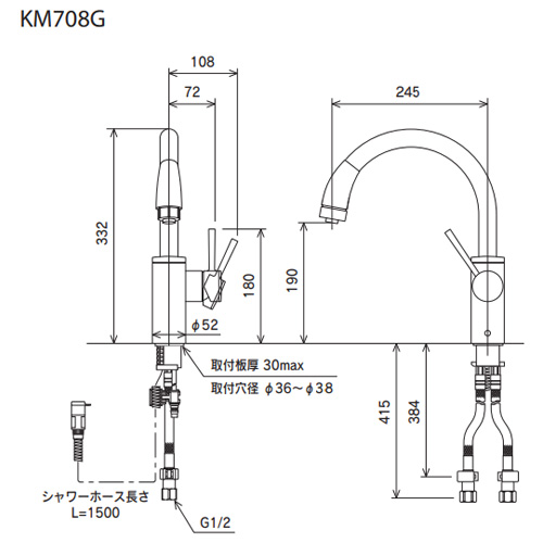 KM708ZG|KVK|キッチン用蛇口[台][シングルレバー混合水栓][流し台用][上施工タイプ][シャワー][ホース引出式][グースネック][寒冷地]|リフォームネクスト