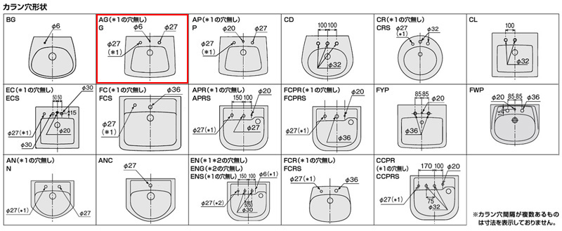 カラン穴形状はAG、BG、Gの3種類があります。