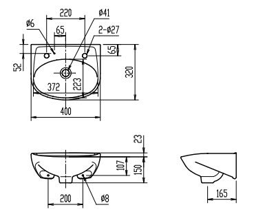手洗器単品[壁掛式][角形][平付大形][水栓取付穴径:φ27][2ヶ所][ゴム栓取付用穴あり]