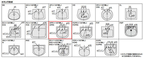 カラン穴形状はAG、G、AP、P、APR、APRS、AN、N、ANC、EC、ECS、FYP、ENG、FCPR、FCPRS、FC、FCS、CD、CL、CR、CCPR、CCPRSの22種類があります。
