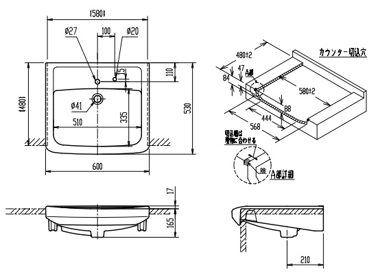 別売のφ27mmの穴径の水栓とプッシュワンウェイ式排水金具またはポップアップ式排水金具と組み合わせて使用して下さい。