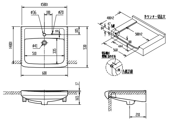 別売のφ36mmの穴径の水栓とプッシュワンウェイ式排水金具またはポップアップ式排水金具と組み合わせて使用して下さい。
