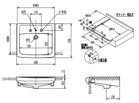 ・水栓取付穴径:φ36 2ヶ所