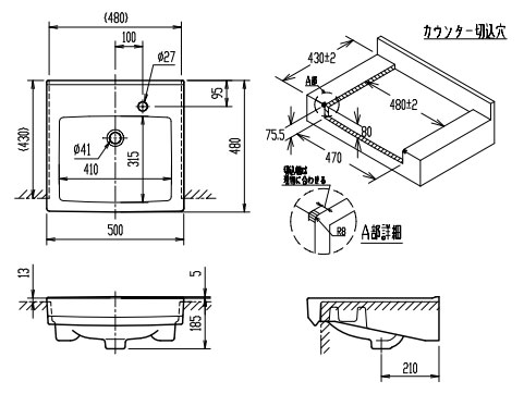 洗面器単品[オーバーカウンター式][角形][水栓取付穴径:φ27][右側1ヶ所]