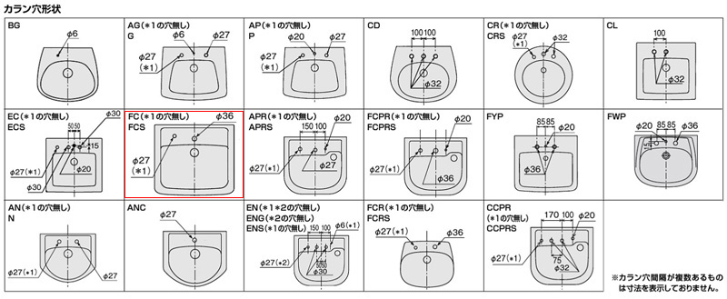 カラン穴形状はAG、G、AP、P、AN、N、ANC、EC、FYP、FC、FCS、CD、CL、CRの14種類があります。