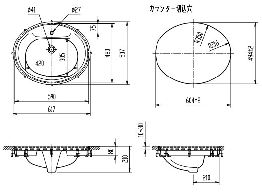 洗面器単品[フレーム式][楕円形][水栓取付穴径:φ27][中央1ヶ所]