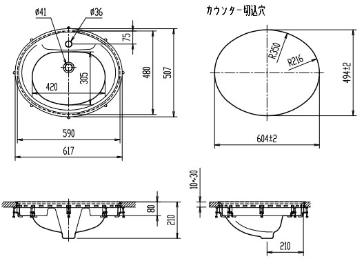 洗面器単品[フレーム式][楕円形][水栓取付穴径:φ36][中央1ヶ所]