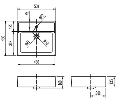 洗面器単品[ベッセル式][壁掛式][角形][500×450][水栓取付穴径:φ27][中央1ヶ所]