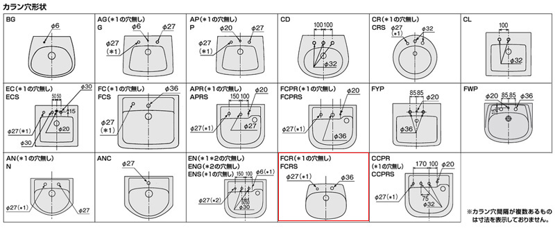 カラン穴形状はN、ANC、FCRS、FCPR、FCの5種類があります。