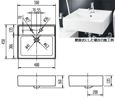 洗面器単品[ベッセル式][壁掛式][角形][500×450][水栓取付穴径:φ36、φ27][2ヶ所]