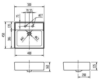 洗面器単品[ベッセル式][壁掛式][角形][500×450][水栓取付穴径:φ27][2ヶ所]