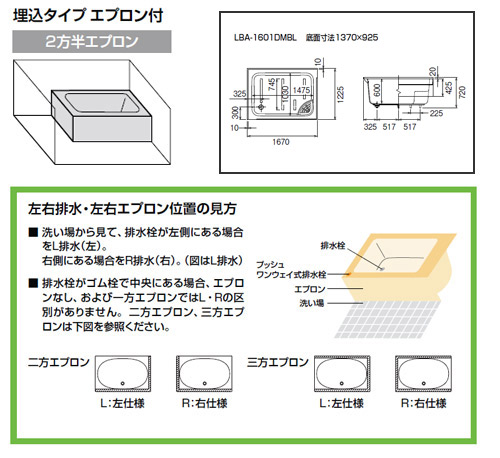 ●浴槽 大型バス[埋込浴槽][和風タイプ][1670サイズ][2方半エプロン][ゴム栓]