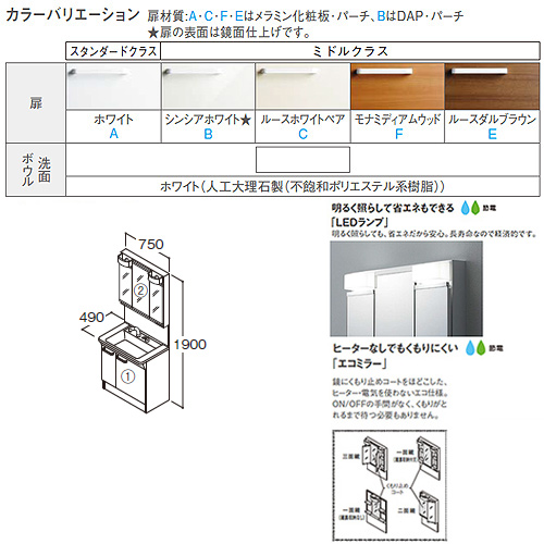 【SALE】洗面化粧台セット Vシリーズ[間口750mm][高さ1900mm][片引き出し][エコシングルシャワー水栓][LED][3面鏡][エコミラー][一般地]▲