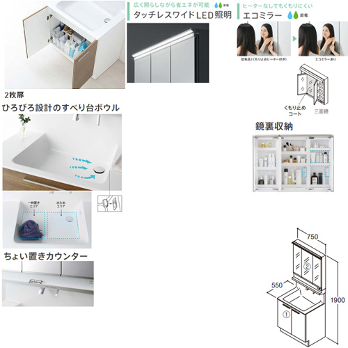 洗面化粧台セット オクターブ[間口750mm][高さ1900mm][2枚扉][シャワー水栓][F1][3面鏡][タッチレスワイドLED][エコミラー][一般地]
