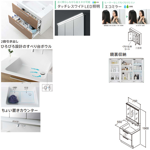 洗面化粧台セット オクターブ[間口750mm][高さ1900mm][2段引き出し][自動水栓][F3][3面鏡][タッチレスワイドLED][エコミラー][一般地]