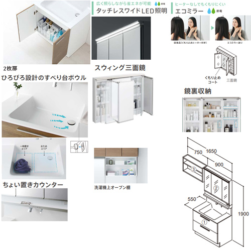 間口:1650mm(洗面台900mm+洗濯機上オープン棚750mm)×高さ:1900mm×奥行き:550mm
