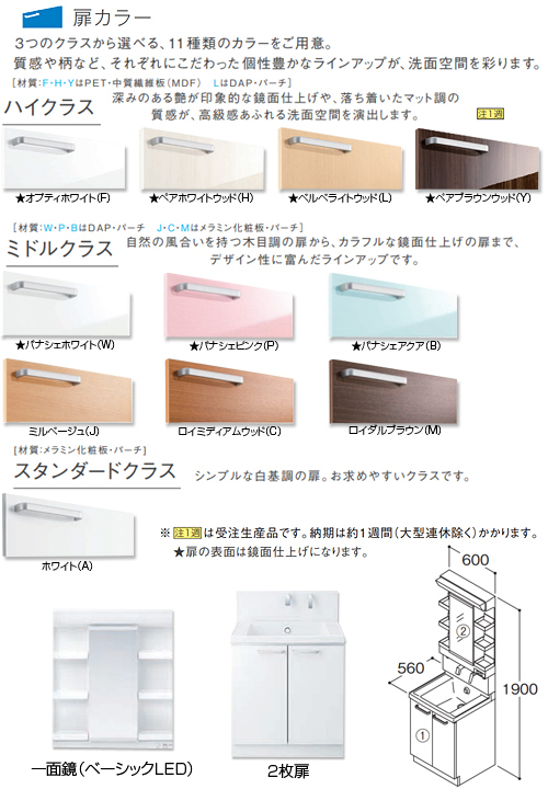 ・扉材質:F/H/YはPET、中質繊維板(MDF) Lはパーチ