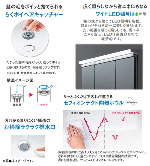 お掃除しやすい陶器ボウルをはじめ、家事や身支度がはかどる機能が満載。