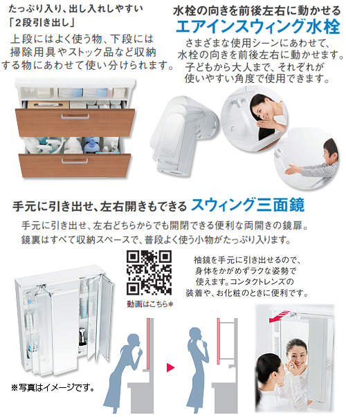 お掃除しやすい陶器ボウルをはじめ、家事や身支度がはかどる機能が満載。