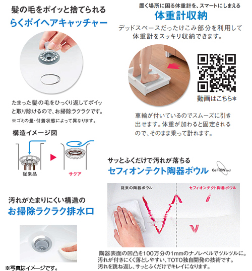お掃除しやすい陶器ボウルをはじめ、家事や身支度がはかどる機能が満載。