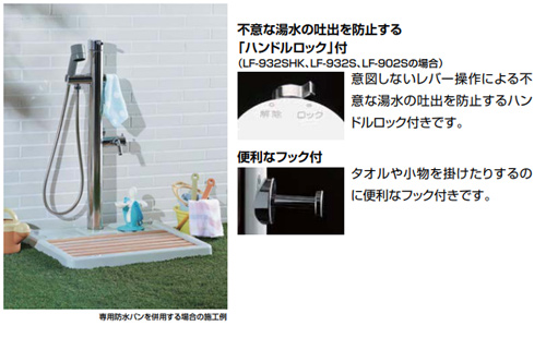 屋外でもお湯のシャワーが使えてペットも大喜び。、ペットの足洗いにやさしい仕様で、猫や小型犬から大型犬まで、ペットのサイズを問わず使えます。