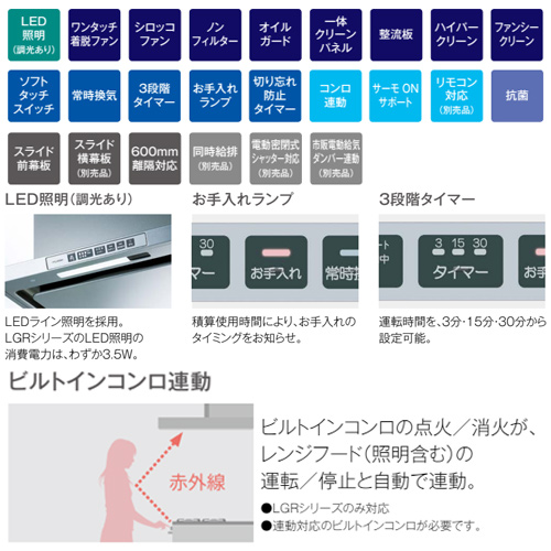 レンジフード LGRシリーズ[シロッコファン][幅90cm][スリム型][前幕板付属][コンロ連動][シルバーメタリック]