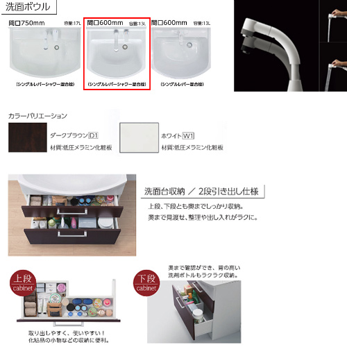 二段引出し・2枚扉が選べる洗面化粧台。