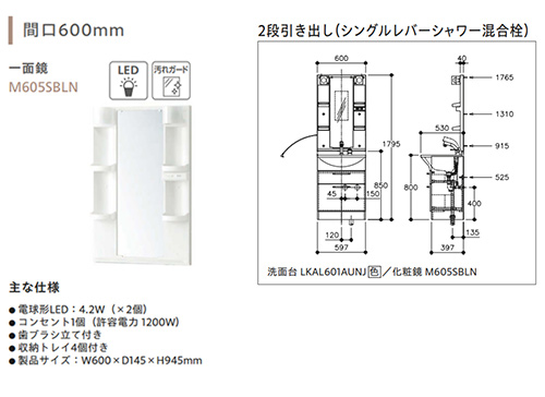 (2)M605SBLN ミラーキャビネット(1面鏡・LED照明)