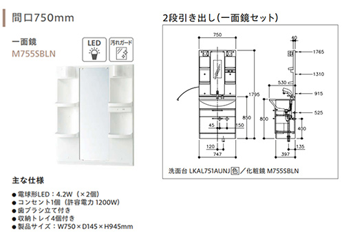 (2)M755SBLN ミラーキャビネット(1面鏡・LED照明)