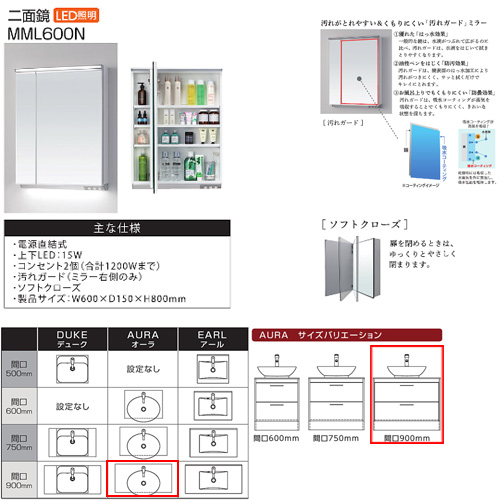 (2)MML600N ミラーキャビネット(2面鏡・LED照明)