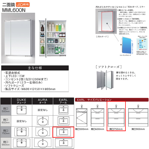 (2)MML600N ミラーキャビネット(2面鏡・LED照明)