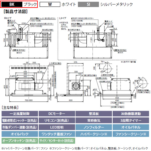 ●レンジフード プレミアムプラスシリーズ[シロッコファン][幅75cm][スリム型][常時換気][コンロ連動][ブラック][右排気]