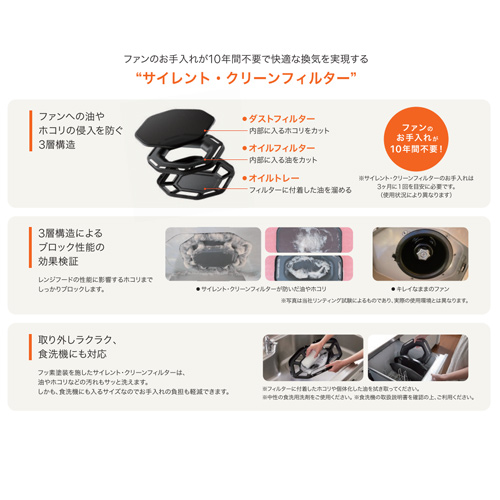 油やホコリがファンに届く手前で約93%ブロックするサイレント・クリーンフィルター搭載。