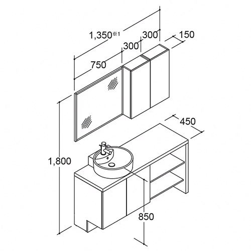 ※有効寸法(壁間寸法)は1360mmですが、カウンター間口はクリアランスを考慮して1350mmになります。