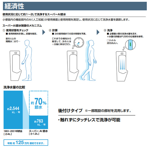 ・スーパーAI節水制御機能を搭載。従来商品(1983〜2001年発売商品)に比べ、約70%の節水が可能。