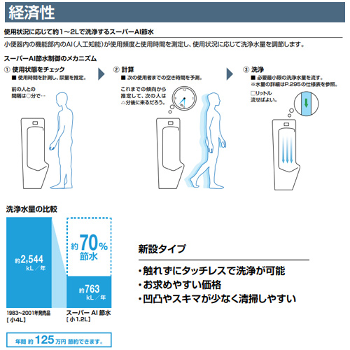 ・スーパーAI節水制御機能を搭載。従来商品(1983〜2001年発売商品)に比べ、約70%の節水が可能。