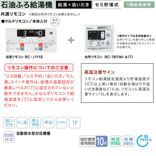 石油ふろ給湯器[浴室・台所リモコンセット][オート][貯湯式][屋外据置型][前面排気][4万キロ]