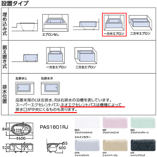 ●浴槽 ネオエクセレントバス[埋込浴槽][1600サイズ][一方半エプロン][ワンプッシュ排水栓式][ブローバスSX2]