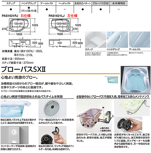 ・ブローバスSX2(浴槽側面4ヵ所からのブロー噴流が、腰や脚をやさしく刺激。仕事やスポーツのあとに最適です)