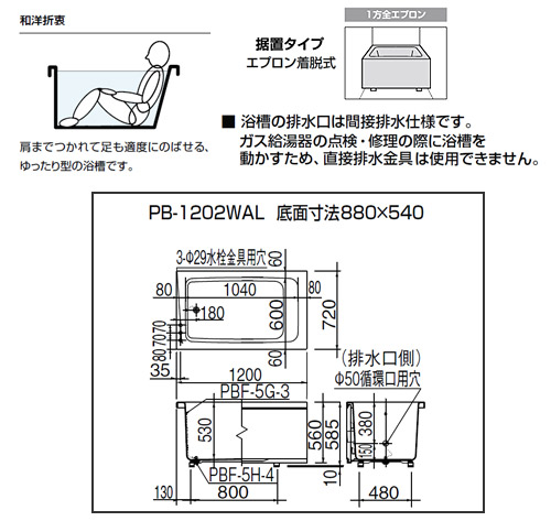 ●浴槽 ホールインワン専用[据置浴槽][和洋折衷タイプ][1200サイズ][1方全エプロン][ガスふろ給湯器][壁貫通タイプ][FRPタイプ]