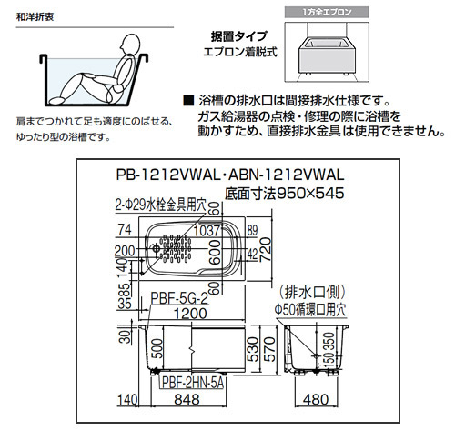 浴槽 ホールインワン専用[据置浴槽][和洋折衷タイプ][1200サイズ][1方全エプロン][ガスふろ給湯器][壁貫通タイプ][FRP浅型タイプ]