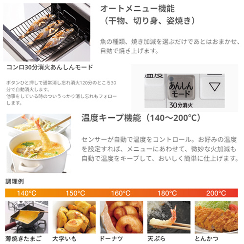 ・温度キープ機能(140〜200℃(7段階)、左右コンロ)