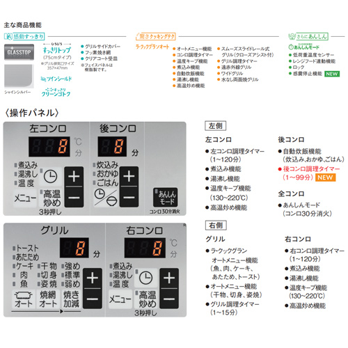 ・コンロ調理タイマー(左右1〜120分/後1〜99分)