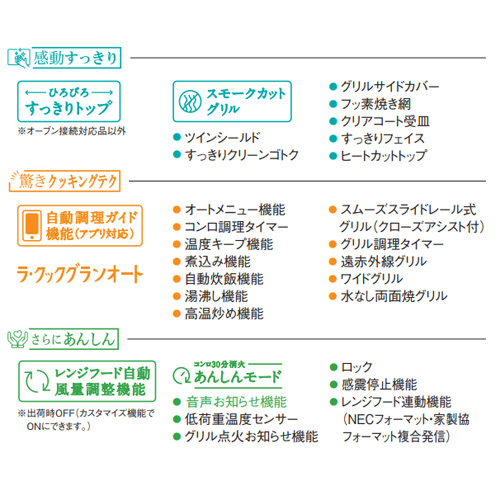 その他おまかせかんたんモード等の料理を快適にする機能や安心機能も搭載されたコンロです。