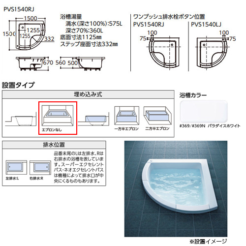 ●浴槽 スーパーエクセレントバス[埋込浴槽][1500サイズ][ワンプッシュ排水栓式][エアブロー2][ソフトピロー付][パラダイスホワイト]