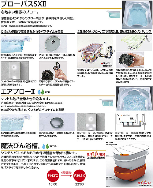 ・ブローバスSX2(浴槽側面4ヵ所からのブロー噴流が、腰や脚をやさしく刺激。仕事やスポーツのあとに最適です)
