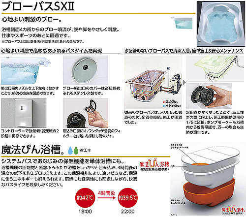 ・ブローバスSX2(浴槽側面4ヵ所からのブロー噴流が、腰や脚をやさしく刺激。仕事やスポーツのあとに最適です)