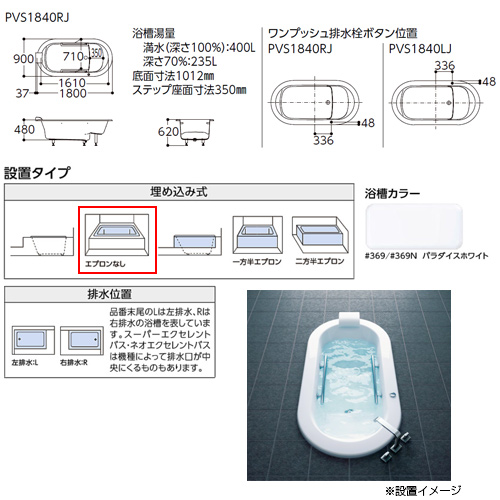 ●浴槽 スーパーエクセレントバス[埋込浴槽][1800サイズ][ワンプッシュ排水栓式][握りバー2本][ソフトピロー付][パラダイスホワイト]