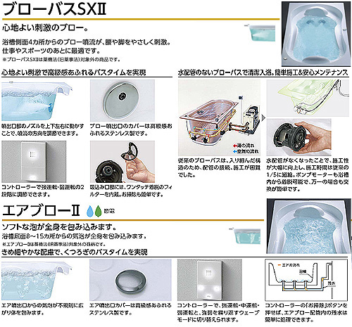 ・ブローバスSX2(浴槽側面4ヵ所からのブロー噴流が、腰や脚をやさしく刺激。仕事やスポーツのあとに最適です)